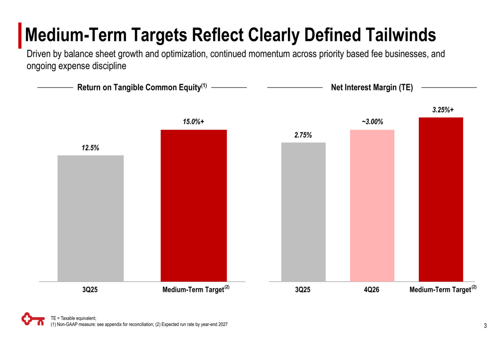 KeyCorp outlined ambitious medium-term targets, expecting to achieve a return on tangible common equity (ROTCE) of 15% or higher by the end of 2027, compared to the current 12.5%. The company also aims to increase its net interest margin to 3.25% or higher by the medium term, from the current level of 2.75%.