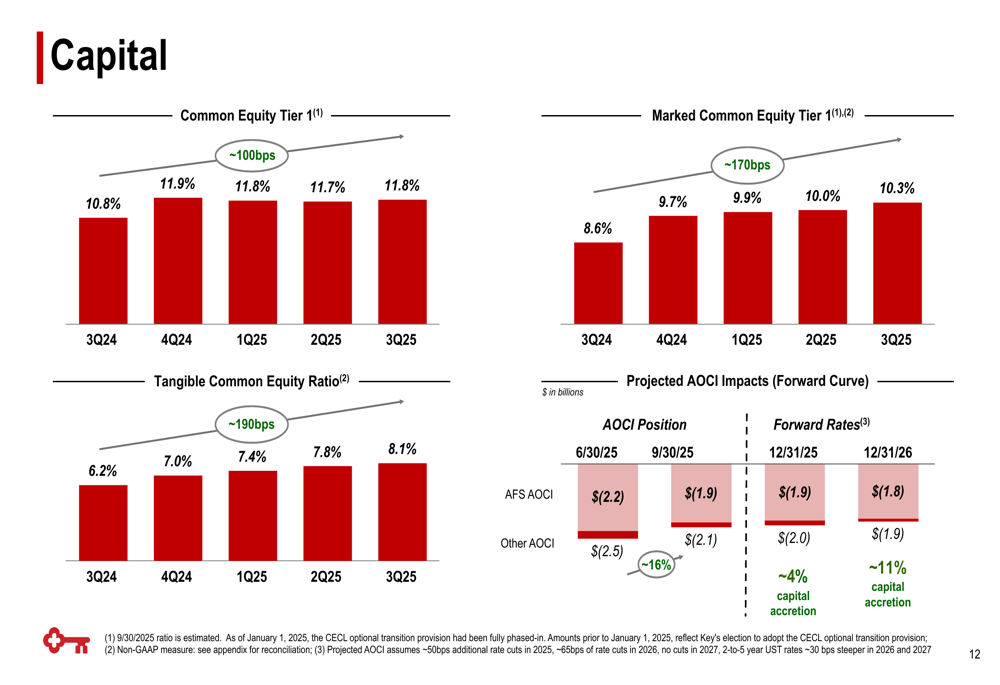 Capital ratios continued to strengthen, with the Common Equity Tier 1 (CET1) ratio increasing to 11.8%, up from 10.8% a year ago. The Marked CET1 ratio, which adjusts for unrealized losses in the available-for-sale securities portfolio, improved to 10.3%, up approximately 170 basis points year-over-year.