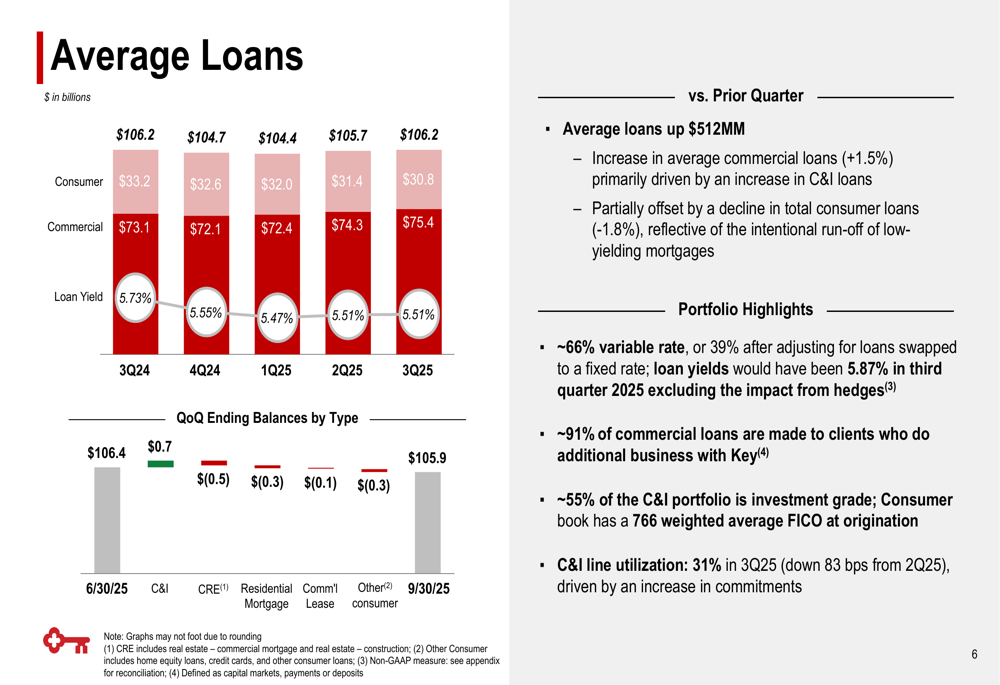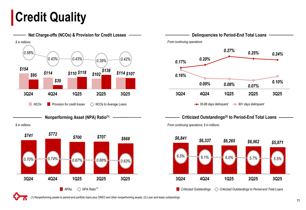 KeyCorp maintained strong credit quality metrics in Q3 2025, with net charge-offs (NCOs) to average loans at 42 basis points and nonperforming assets (NPAs) to loans plus OREO at 63 basis points. The company’s allowance for credit losses remained stable, with a small release of $7 million during the quarter.