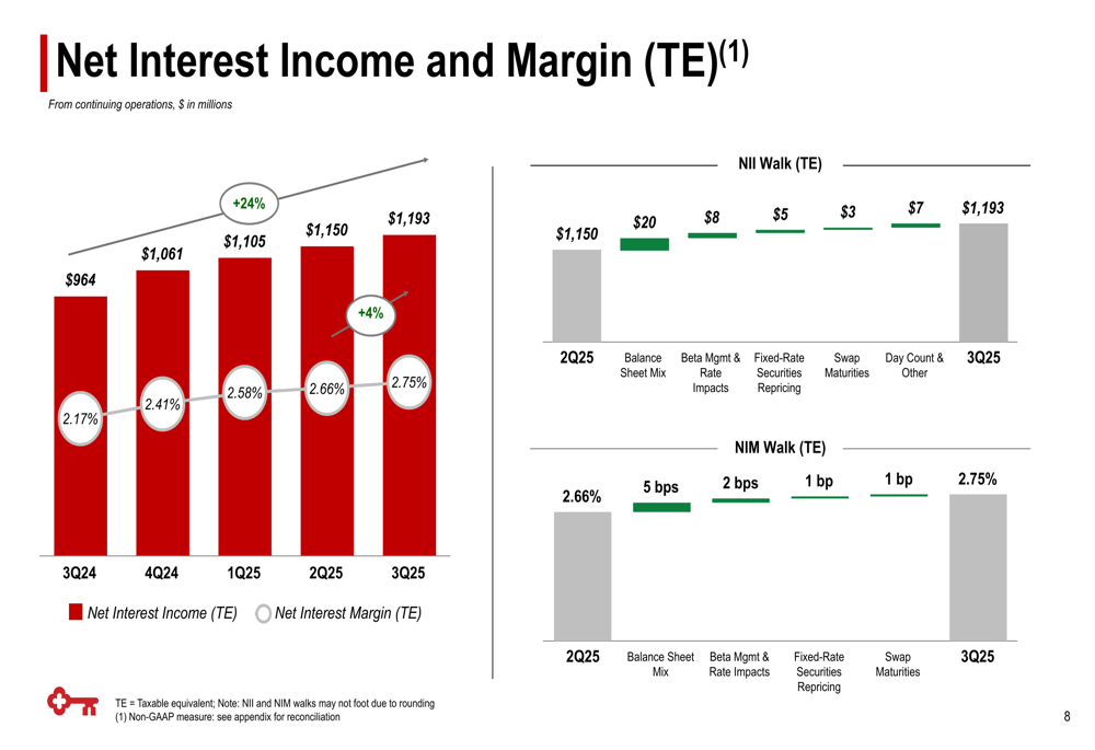 Net interest income (NII) showed impressive growth, increasing by 24% year-over-year to $1,193 million in Q3 2025, up from $964 million in Q3 2024. This growth was supported by improvements in balance sheet mix, beta management, and swap maturities.
