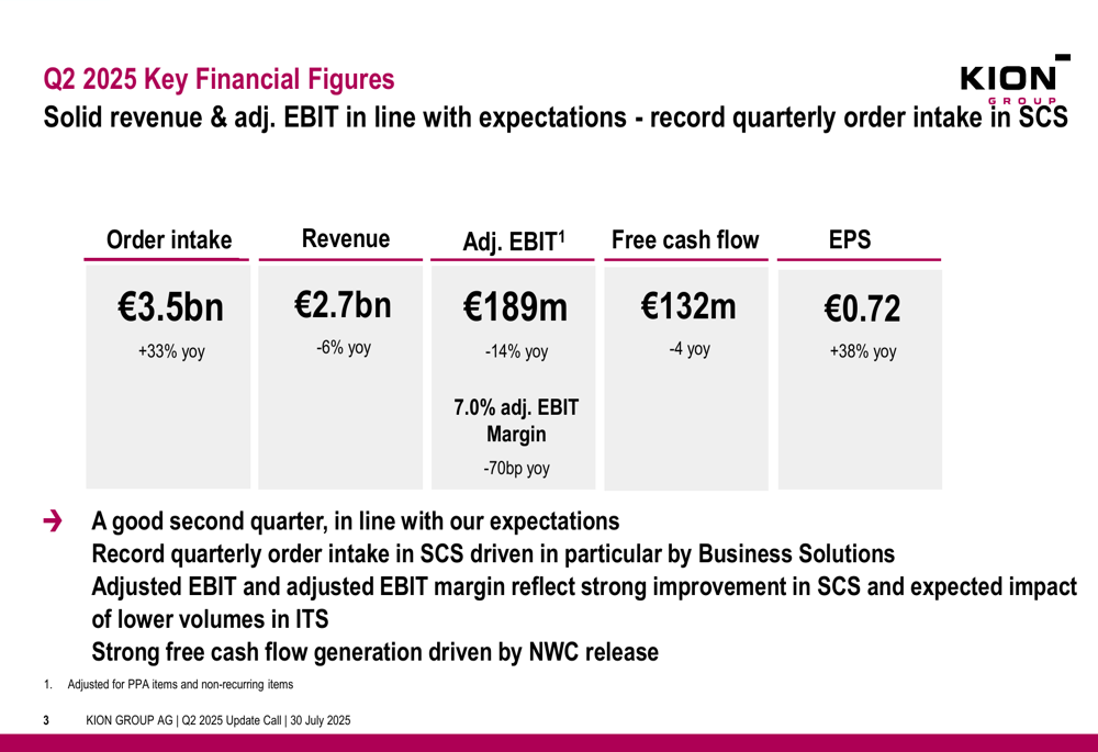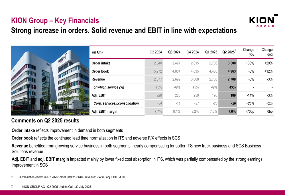 KION Group AG (ETR:KGX) presented its Q2 2025 financial results on July 30, 2025, revealing a mixed performance characterized by record order intake but declining revenue. Following the announcement, the company’s stock fell 4.42%, closing at €56.6, despite several positive metrics. The presentation, delivered by CEO Rob Smith and CFO Christian Harm, highlighted the company’s resilience in a challenging economic environment marked by trade conflicts and geopolitical uncertainties.