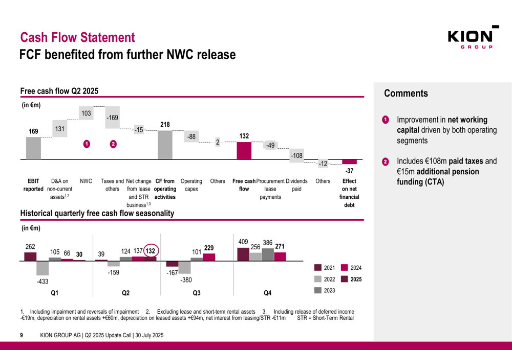 KION highlighted several strategic initiatives aimed at improving long-term performance. The company is implementing an efficiency program announced in February 2025, which targets sustainable annual cost savings of €140-160 million from 2026 onwards. This program has already incurred non-recurring expenses of €197 million in the first half of 2025, with the remainder expected in the second half of the year.