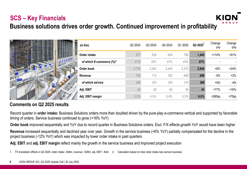 The Supply Chain Solutions (SCS) segment was the standout performer, achieving a record quarterly order intake of €1.445 billion, representing a remarkable 114% year-over-year increase. This growth was primarily driven by the e-commerce sector, which accounted for 87% of SCS orders. The segment’s adjusted EBIT increased 77% year-over-year to €42 million, with the margin expanding 280 basis points to 6.0%.
