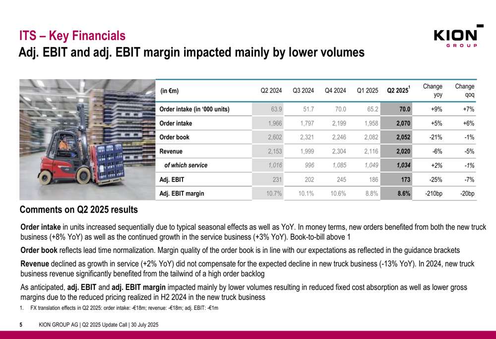 KION’s service business continues to be a bright spot, growing to 49% of total revenue in Q2 2025, up from 45% in the prior year. This shift toward higher-margin service revenue is part of the company’s strategy to improve overall profitability and reduce cyclicality.