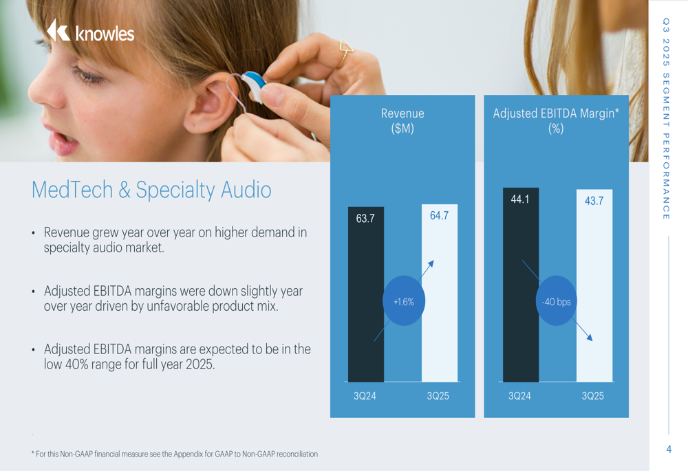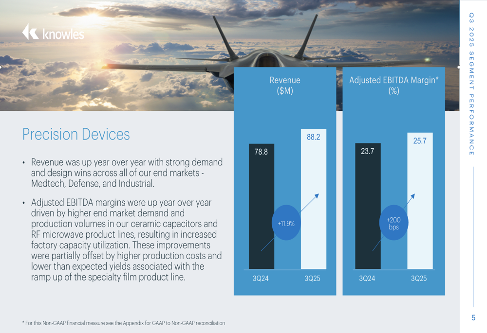 Knowles operates through two main business segments: MedTech & Specialty Audio and Precision Devices. The Precision Devices segment was the primary growth driver in Q3, while MedTech & Specialty Audio showed more modest improvement.