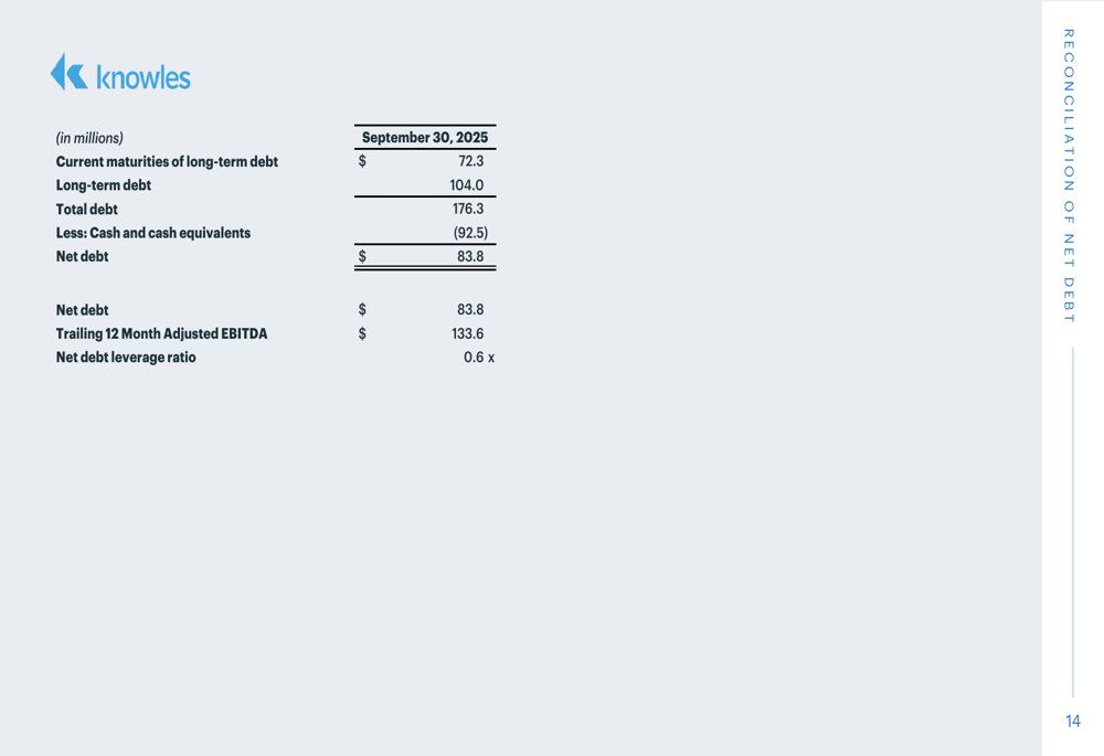Knowles maintains a strong balance sheet with manageable debt levels. As of September 30, 2025, the company reported total debt of $176.3 million, offset by $92.5 million in cash and cash equivalents, resulting in a net debt position of $83.8 million.