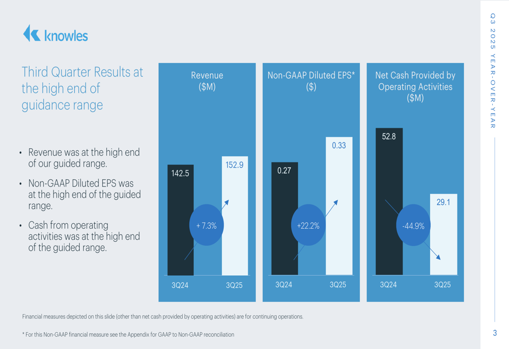 Knowles delivered revenue of $152.9 million in the third quarter of 2025, representing a 7.3% increase from $142.5 million in the same period last year. Non-GAAP diluted earnings per share reached $0.33, up 22.2% year-over-year from $0.27, exceeding analyst expectations of $0.31. The company noted that these results came in at the high end of their guidance range.