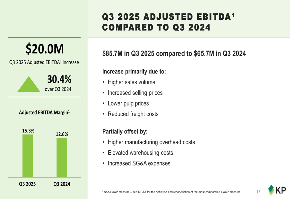 KP Tissue delivered impressive financial results for Q3 2025, with revenue reaching $561.1 million, a 7.7% increase compared to the same period last year. The company’s adjusted EBITDA showed even stronger growth, jumping 30.4% year-over-year to $85.7 million.