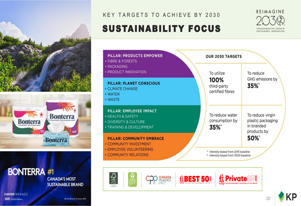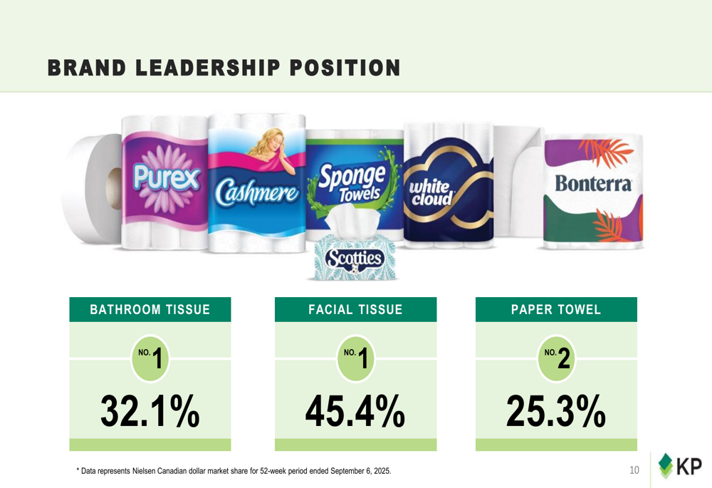 KP Tissue maintains strong market positions across its product categories, holding the #1 position in both bathroom tissue (32.1% market share) and facial tissue (45.4% market share), as well as the #2 position in paper towels (25.3% market share) in Canada: