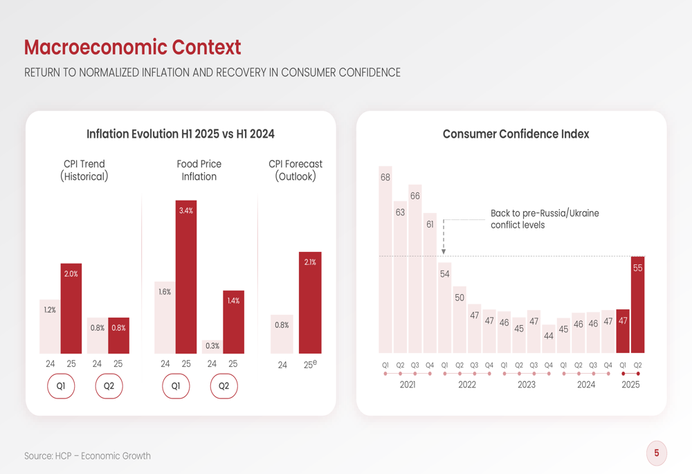 Consumer confidence has also recovered significantly, reaching 55 in Q2 2025 and returning to pre-Russia/Ukraine conflict levels. Meanwhile, inflation has normalized with the Consumer Price Index at just 0.8% in Q2 2025, creating favorable conditions for retail spending.