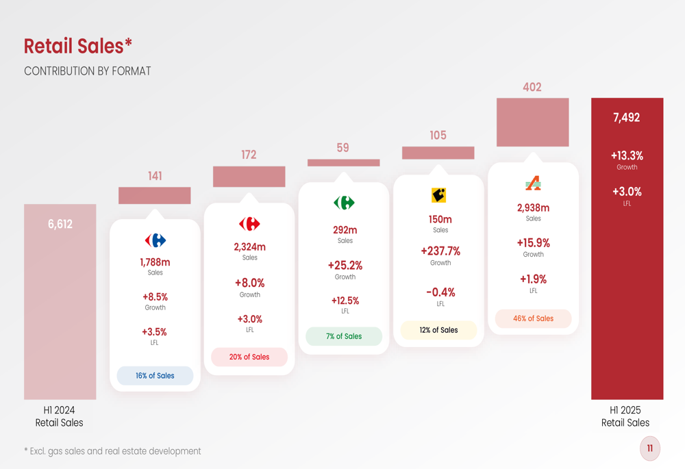 Looking at performance by store format, Atacadao (cash & carry format) remained the largest contributor to sales at 39% of total retail sales, generating MAD 2,938 million with growth of 15.9%. Carrefour Market (supermarket format) represented 31% of sales at MAD 2,324 million, while Carrefour hypermarkets accounted for 24% with MAD 1,788 million in sales.