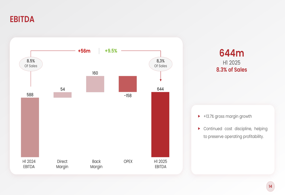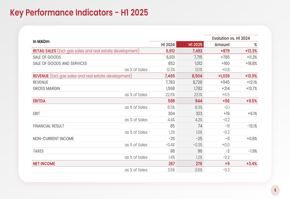 Net income grew more modestly at 3.4% to reach MAD 276 million. The financial result declined by 13.1% to MAD 74 million, largely due to a one-off gain of MAD 36 million from Terramis in H1 2024. Excluding this exceptional item, the financial result would have improved by 49% year-over-year.