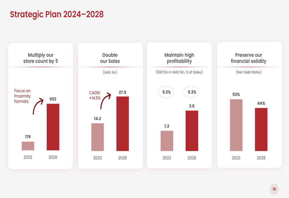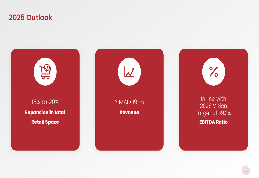 The company expects to expand its total retail space by 15-20% in 2025, with acceleration in new openings anticipated in H2 2025. Revenue is projected to exceed MAD 19 billion for the full year, while EBITDA margin is expected to align with the company’s 2028 target of approximately 9.3%.