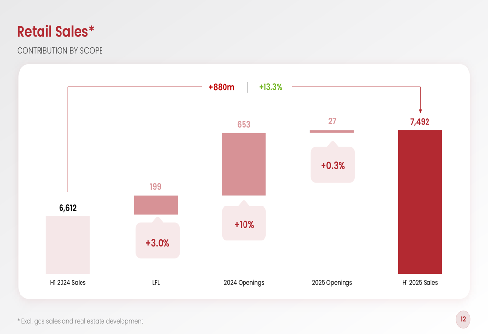 The growth in retail sales was driven by a combination of like-for-like growth of 3.0% and expansion, with new store openings in 2024 and 2025 contributing 10.3% to overall sales growth. The company added 44 new stores during the period, primarily in the Supeco discount format, which saw its store count increase dramatically from 81 to 125 locations.