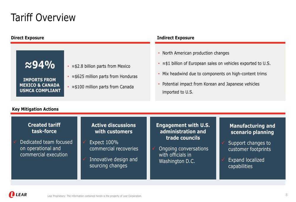 The following slide outlines Lear’s tariff exposure and mitigation strategies: