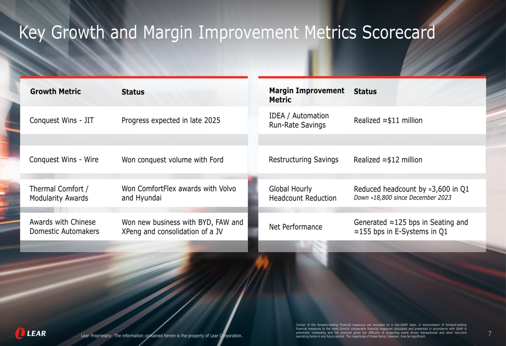 Lear continues to execute on its strategic growth and margin improvement initiatives, as evidenced by its metrics scorecard. The company reported progress in several key areas, including conquest wins with Ford in its wire business, thermal comfort awards with Volvo (OTC:VLVLY) and Hyundai (OTC:HYMTF), and new business with Chinese automakers including BYD (SZ:002594), FAW, and XPeng (NYSE:XPEV).