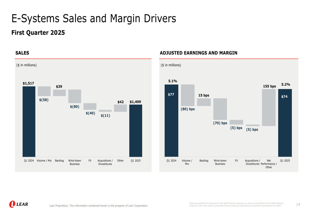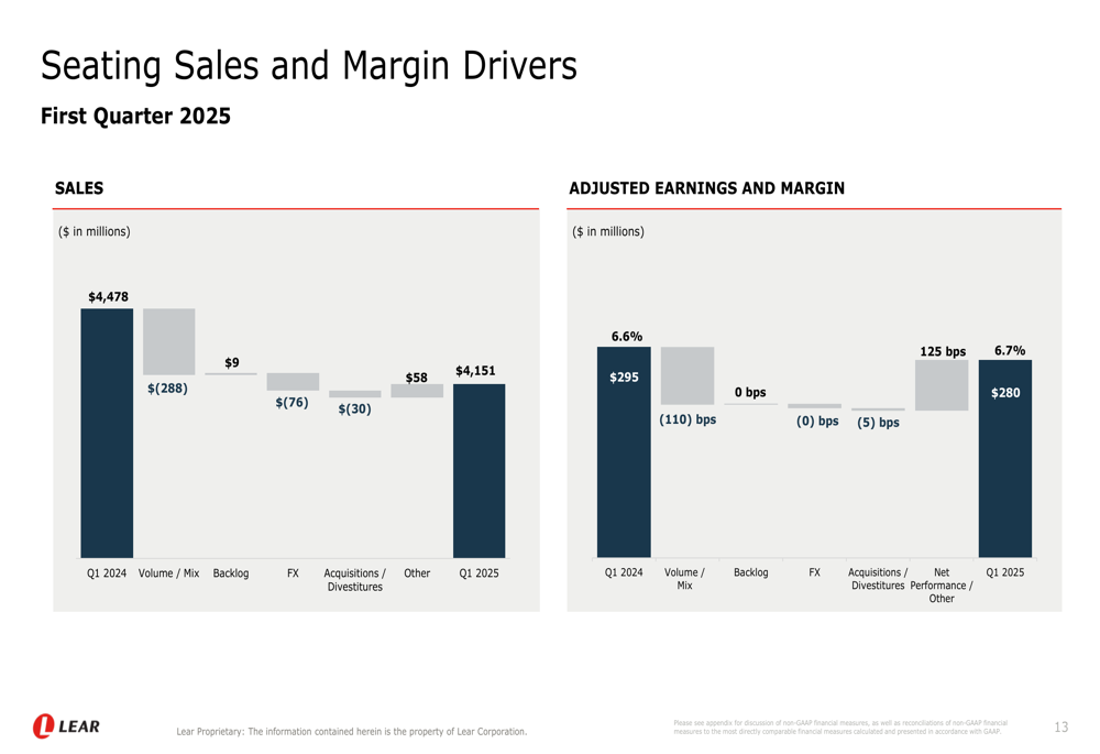 Lear’s Seating segment, which represents approximately 75% of total revenue, reported sales of $4.15 billion in Q1 2025, down from $4.48 billion in Q1 2024. Despite the revenue decline, the segment’s adjusted margin improved slightly to 6.7% from 6.6% in the prior year period. This improvement was primarily driven by strong net performance, which contributed approximately 125 basis points to the margin, offsetting negative impacts from volume/mix.