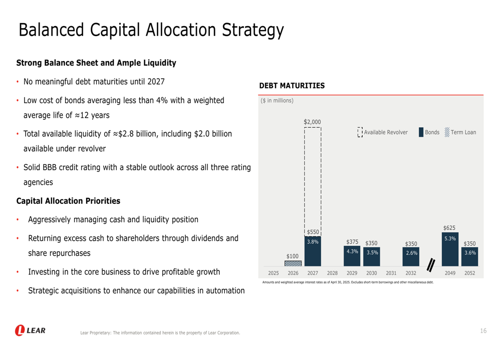 Despite the challenging operating environment, Lear maintains a strong financial position with a balanced capital allocation strategy. The company has no meaningful debt maturities until 2027, with low-cost bonds averaging less than 4% and a weighted average life of approximately 12 years. Lear’s total available liquidity stands at approximately $2.8 billion, including $2.0 billion available under its revolving credit facility.