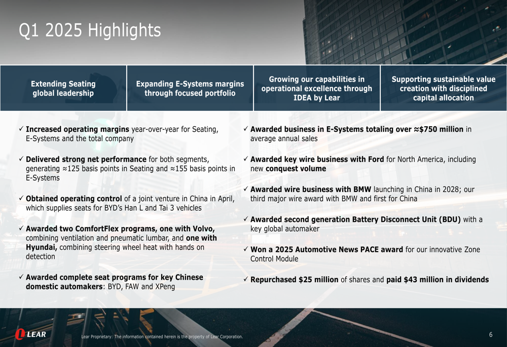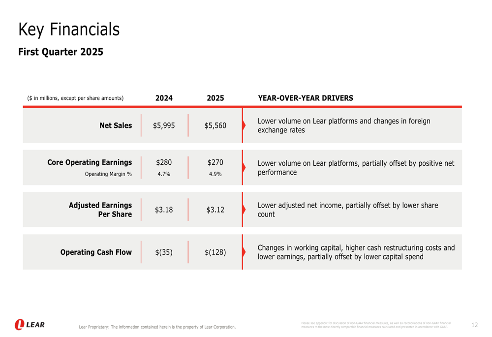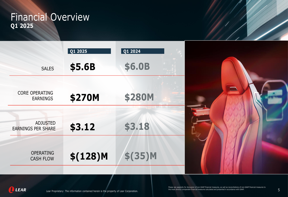 The following table provides a comprehensive overview of Lear’s key financial metrics for Q1 2025: