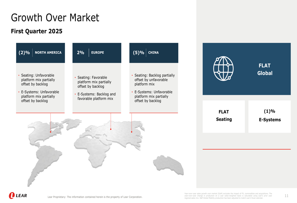 In terms of market performance, Lear’s growth relative to the overall market varied by region. The company reported flat global growth over market, with 2% outperformance in Europe offset by underperformance in North America (-2%) and China (-5%). This regional performance is illustrated in the following growth over market slide: