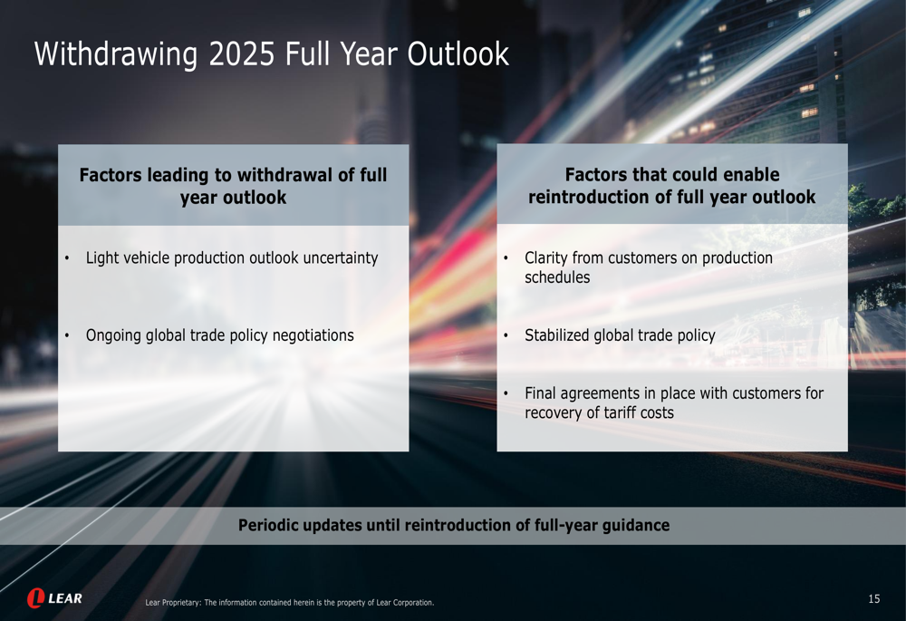 In a significant development, Lear announced the withdrawal of its 2025 full-year outlook, citing uncertainties in light vehicle production and ongoing global trade policy negotiations. The company indicated that it would provide periodic updates and could reintroduce guidance once there is greater clarity from customers on production schedules, stabilized global trade policy, and final agreements with customers for recovery of tariff costs.