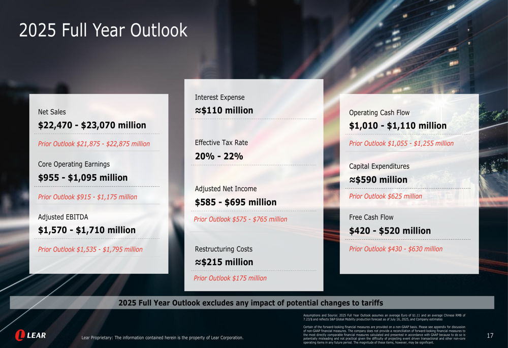 Lear has restored its full-year guidance for 2025, projecting net sales of $22,470 to $23,070 million and core operating earnings of $955 to $1,095 million. The company expects to generate free cash flow of $420 to $520 million for the year.