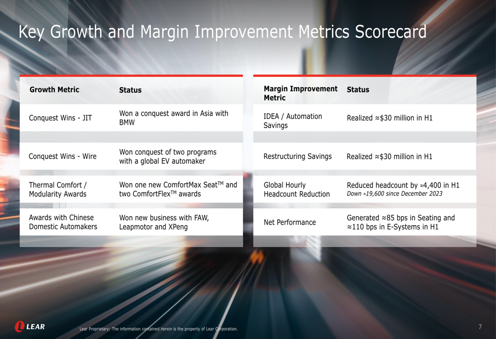 Lear’s scorecard of growth and margin improvement metrics demonstrates the company’s progress in winning new business while enhancing operational efficiency:
