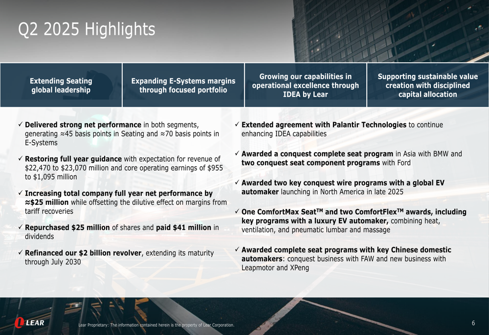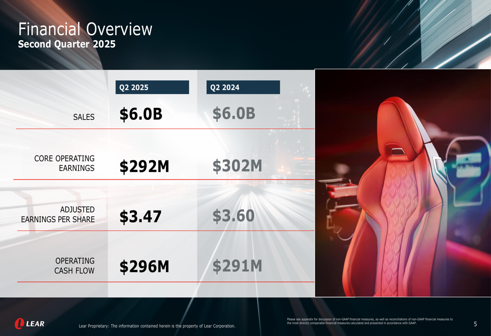 The following slide provides a comprehensive overview of Lear’s second quarter financial performance: