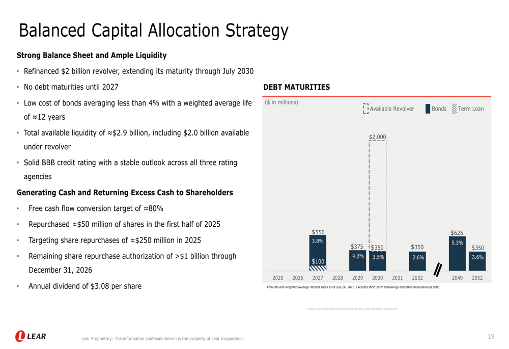 The company maintains a balanced capital allocation strategy, focusing on maintaining a strong balance sheet while returning excess cash to shareholders. Lear refinanced its $2 billion revolver, extending its maturity through July 2030, and has no debt maturities until 2027. The company is targeting share repurchases of approximately $250 million in 2025 and maintains an annual dividend of $3.08 per share.