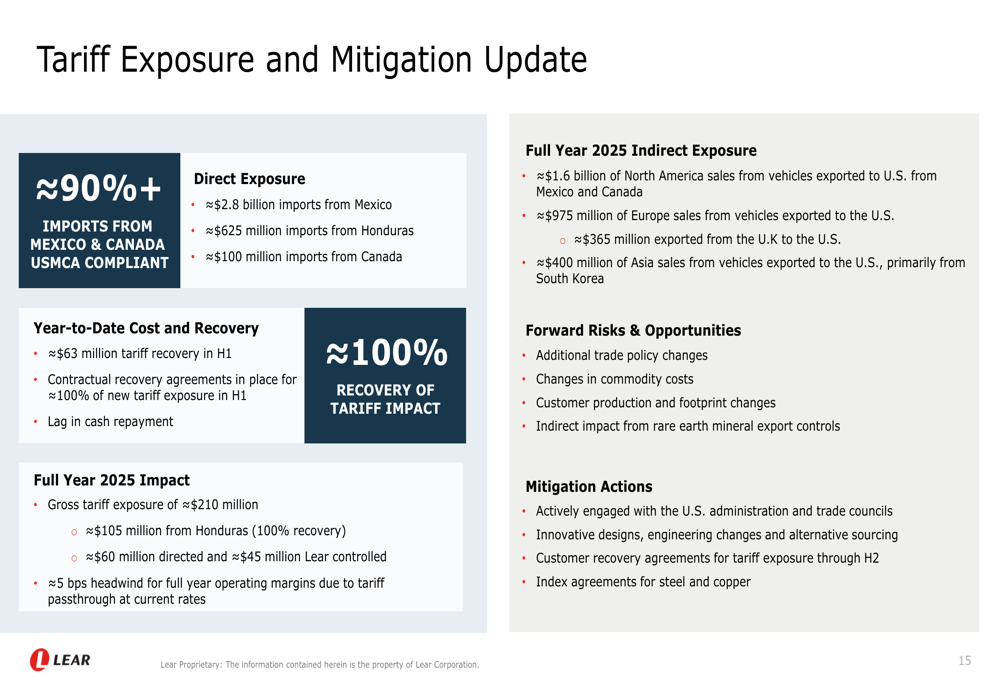 Lear provided a detailed update on its tariff exposure and mitigation strategies. The company has approximately $2.8 billion in imports from Mexico, $625 million from Honduras, and $100 million from Canada, with over 90% of imports from Mexico and Canada being USMCA compliant. Lear has secured contractual recovery agreements for approximately 100% of new tariff exposure in the first half of 2025.