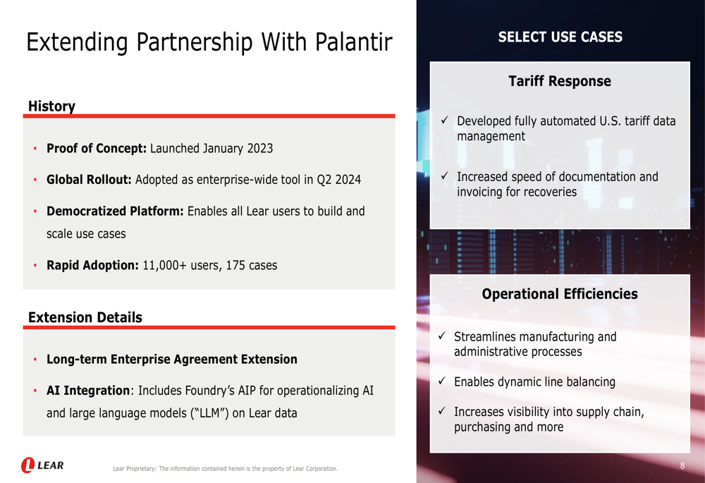 A significant strategic development is Lear’s extended partnership with Palantir Technologies to enhance its IDEA platform capabilities. The partnership, which began with a proof of concept in January 2023, has rapidly expanded to over 11,000 users with 175 use cases. The extension includes AI integration through Foundry’s AIP and has delivered tangible benefits in tariff response and operational efficiencies.