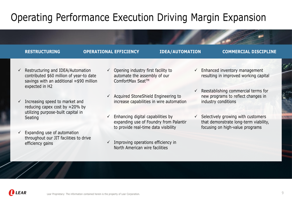 Lear is focusing on operational efficiency to drive margin expansion through four key initiatives: restructuring, operational efficiency, IDEA/automation, and commercial discipline. The company has realized approximately $30 million in IDEA/Automation savings and $30 million in restructuring savings in the first half of 2025.