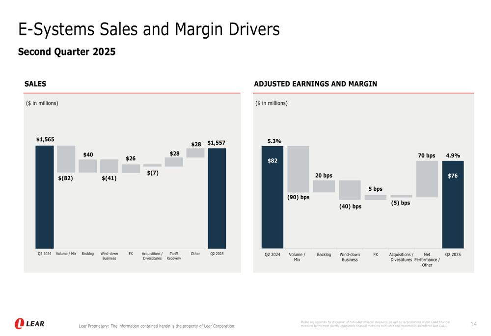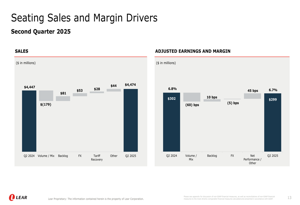 Lear’s Seating segment reported sales of $4.47 billion in Q2 2025, slightly higher than the $4.45 billion in Q2 2024. Despite positive contributions from backlog, foreign exchange, and tariff recovery, the segment faced headwinds from lower volume and mix. Adjusted earnings for the segment were $299 million with a margin of 6.7%, compared to $302 million and 6.8% in the prior year.
