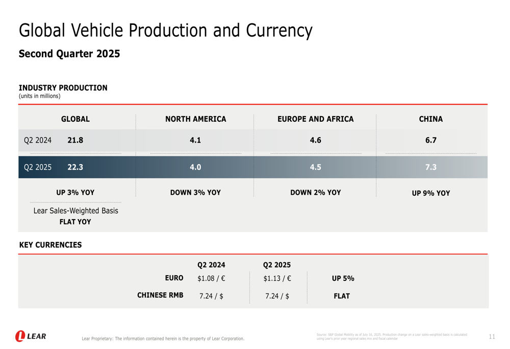 While global production increased by 3% compared to Q2 2024, North America and Europe experienced declines of 3% and 2% respectively. China was the bright spot with a 9% increase in production volumes. These regional variations created a challenging operating environment for automotive suppliers like Lear.