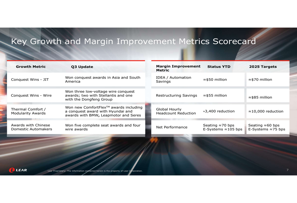 Lear is pursuing several strategic initiatives to drive future growth and margin improvement. The company has developed a detailed scorecard to track progress on key metrics: