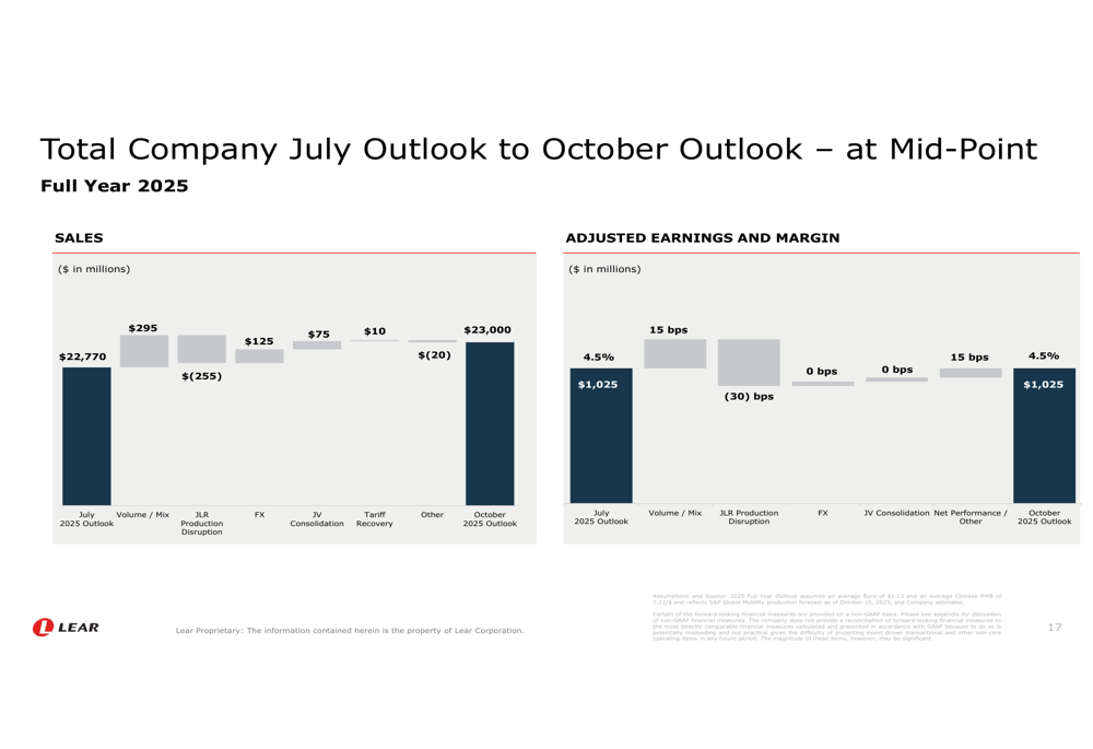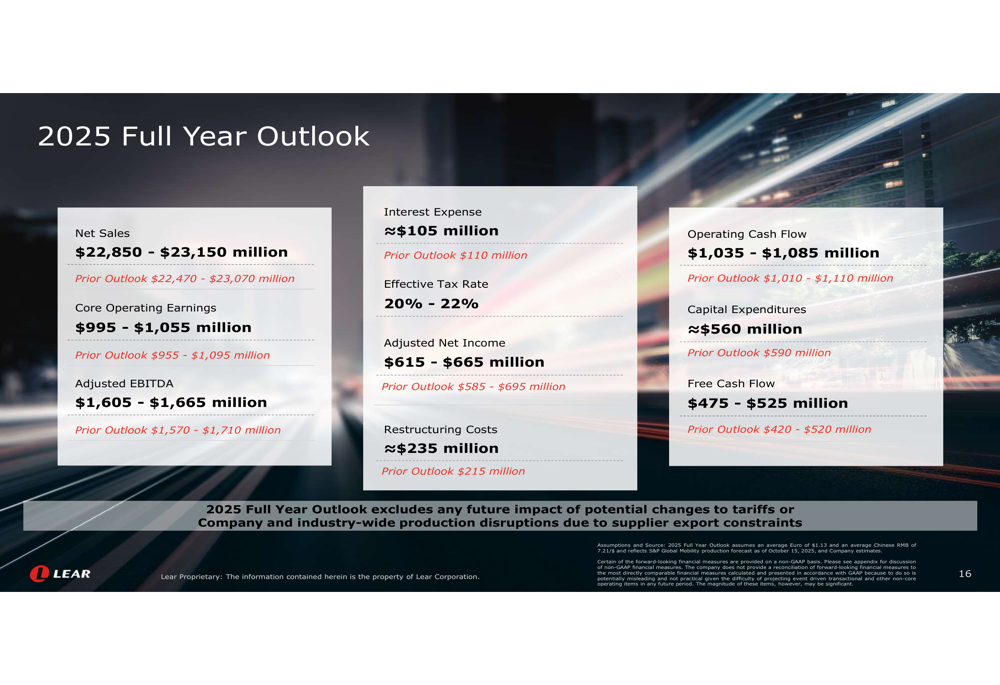 Lear provided a detailed outlook for the full year 2025, maintaining its core operating earnings guidance while slightly raising its sales forecast: