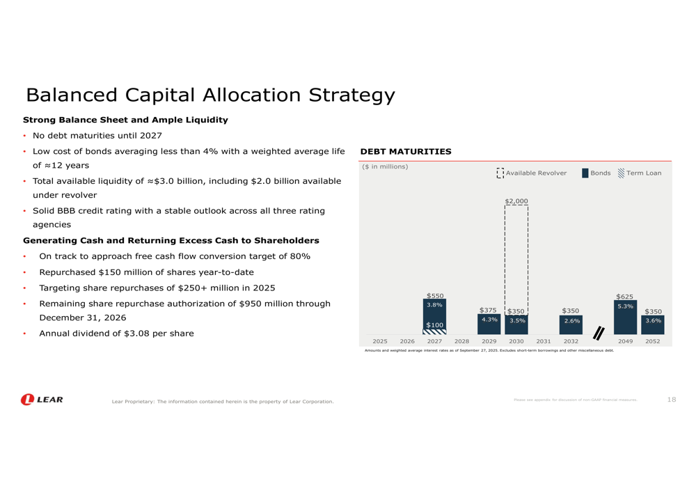Lear also emphasized its balanced capital allocation strategy, which includes maintaining a strong balance sheet while returning cash to shareholders: