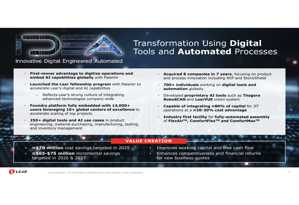A central element of Lear’s strategy is its digital transformation and automation initiative, branded as "IDEA by Lear" (Innovative Digital Engineered Automated). The company has partnered with Palantir to embed AI capabilities across its global operations, with 14,000+ users leveraging digital tools through 10+ global centers of excellence.