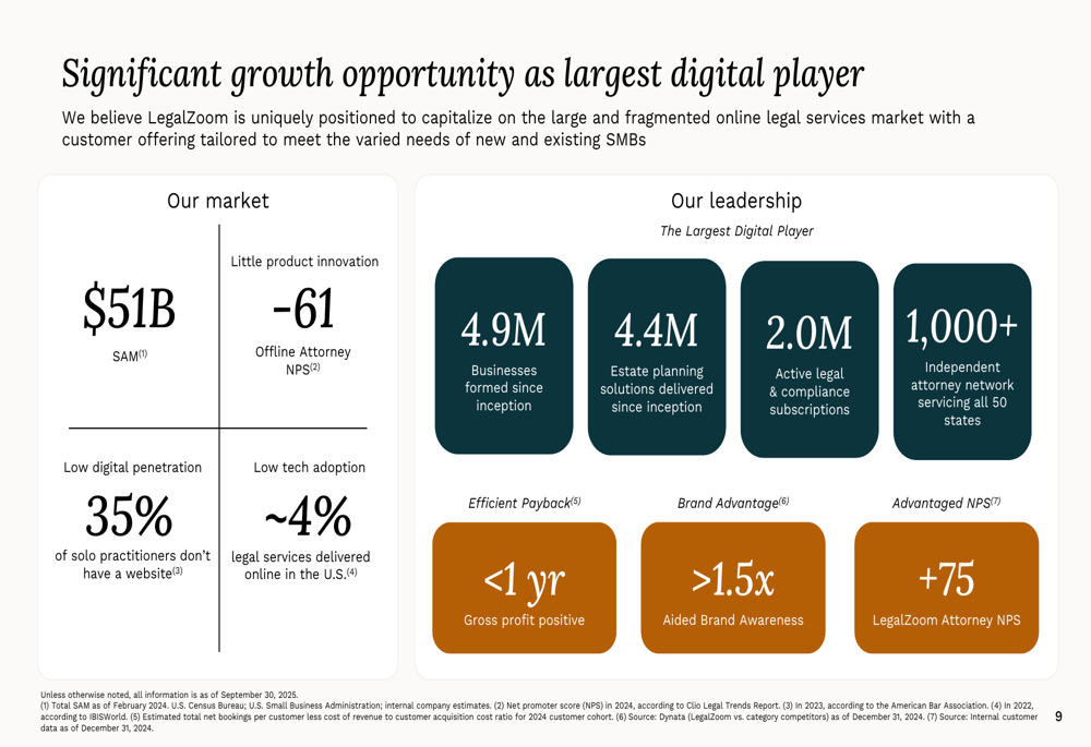 LegalZoom's Q3 2025 presentation portrays a company in transition, successfully growing revenue through its subscription model while investing in AI capabilities and strategic partnerships to expand its addressable market. Despite profitability challenges reflected in the EPS miss, the raised full-year guidance suggests management confidence in the company's strategic direction.