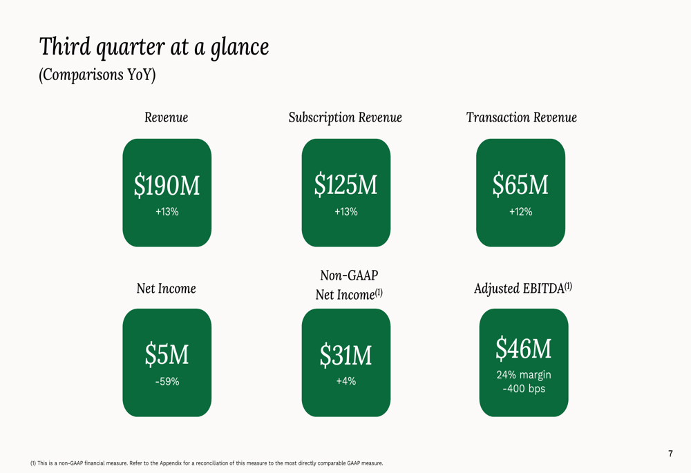 Subscription revenue, which includes registered agent services, compliance packages, attorney advice, and other recurring services, grew 13% year-over-year to $125 million. Transaction revenue, primarily from business formations and other one-time services, increased 12% to $65 million during the same period.
