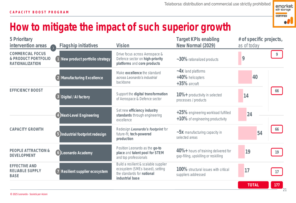 Leonardo is implementing a comprehensive approach to mitigate the impact of superior growth, focusing on five key intervention areas: commercial focus & product portfolio rationalization, efficiency boost, capacity growth, people attraction & development, and an effective and reliable supply base.