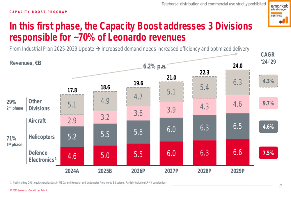 A significant focus of Leonardo’s presentation was the Capacity Boost program, designed to address increased demand across three divisions that represent approximately 70% of the company’s revenue: Aircraft, Helicopters, and Defence Electronics.
