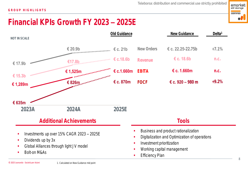 Based on the strong performance in the first half of 2025, Leonardo has upgraded its full-year guidance for new orders, free operating cash flow, and net debt. The company now expects new orders to reach €22.25-22.75 billion, up from the previous guidance of €21 billion, representing a 7.1% increase.