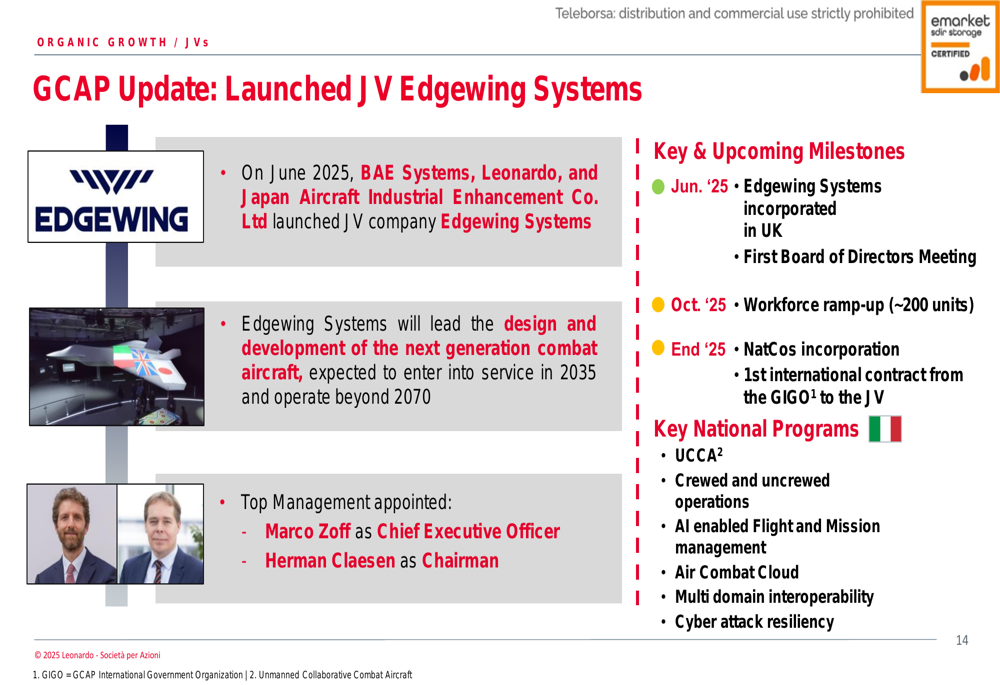 3. GCAP (Global Combat Air Programme): Leonardo announced the launch of Edgewing Systems, a joint venture with BAE Systems and Japan Aircraft Industrial Enhancement Co. Ltd. The JV will lead the design and development of next-generation combat aircraft expected to enter service in 2035.