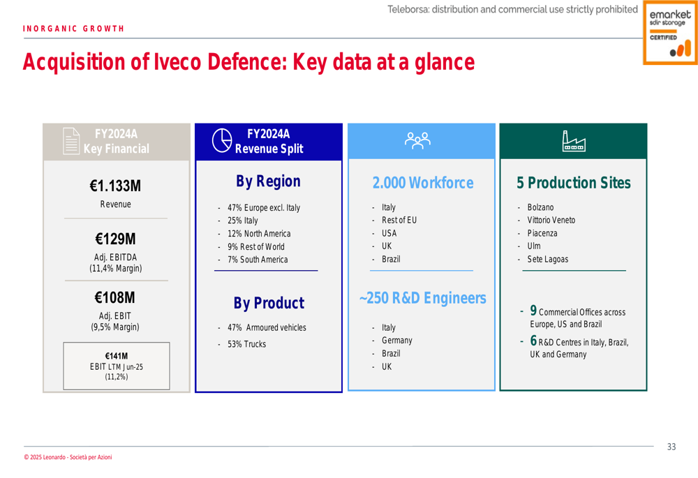 Iveco Defence brings substantial scale to Leonardo’s land capabilities, with FY2024 revenue of €1.133 billion and adjusted EBITDA of €129 million (11.4% margin). The company has a diverse geographic footprint with 47% of revenue from Europe (excluding Italy), 25% from Italy, and 12% from North America.