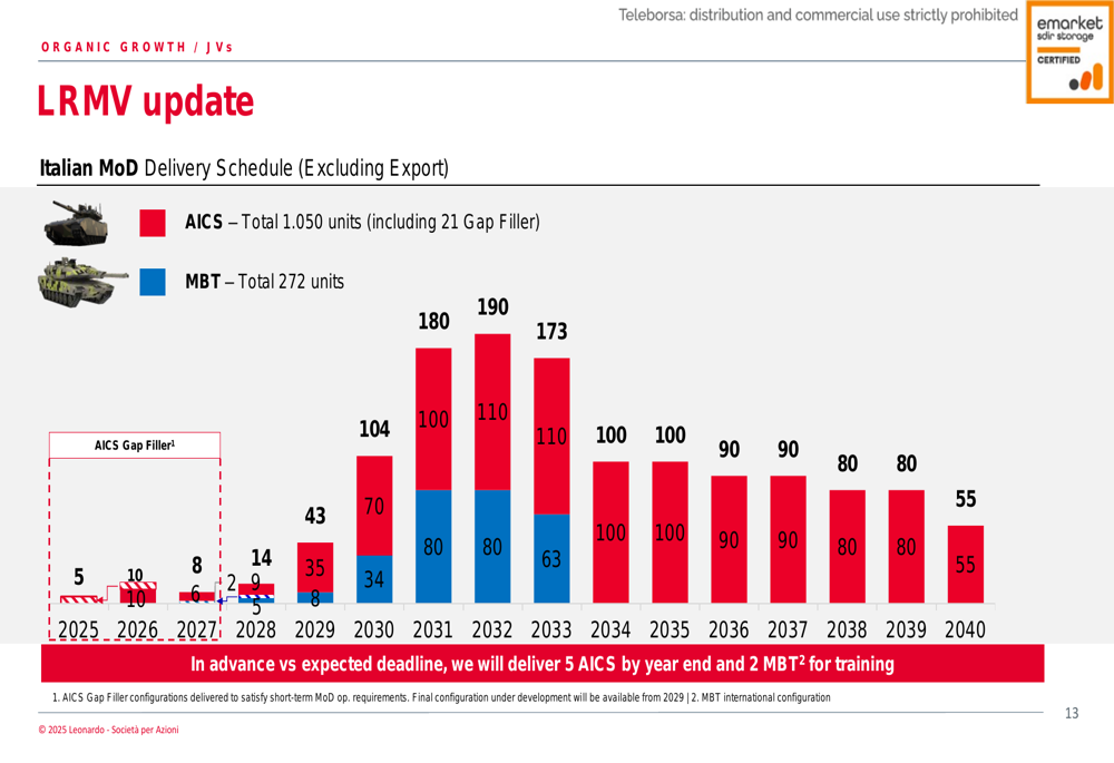 2. LRMV (Light Reconnaissance and Medium Vehicles): Leonardo provided an update on the delivery schedule for the Italian Ministry of Defense, with plans to deliver 5 AICS units and 2 MBT units by the end of 2025, ahead of the expected deadline.