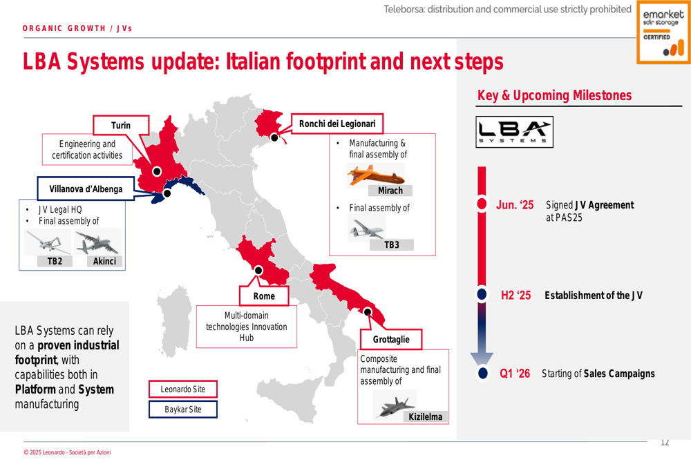 1. LBA Systems: A joint venture with Turkish defense company Baykar, focusing on drone manufacturing with multiple sites across Italy. The JV agreement was signed in June 2025, with operations expected to begin in the second half of the year.