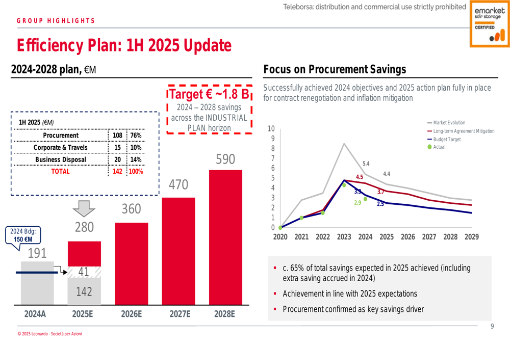 The company’s efficiency plan is progressing well, targeting approximately €1.8 billion in savings from 2024 to 2028. In the first half of 2025, Leonardo achieved €142 million in savings, representing about 65% of the total expected for the year. Procurement remains the key driver, accounting for 76% of the savings, followed by business disposal (14%) and corporate & travel expenses (10%).