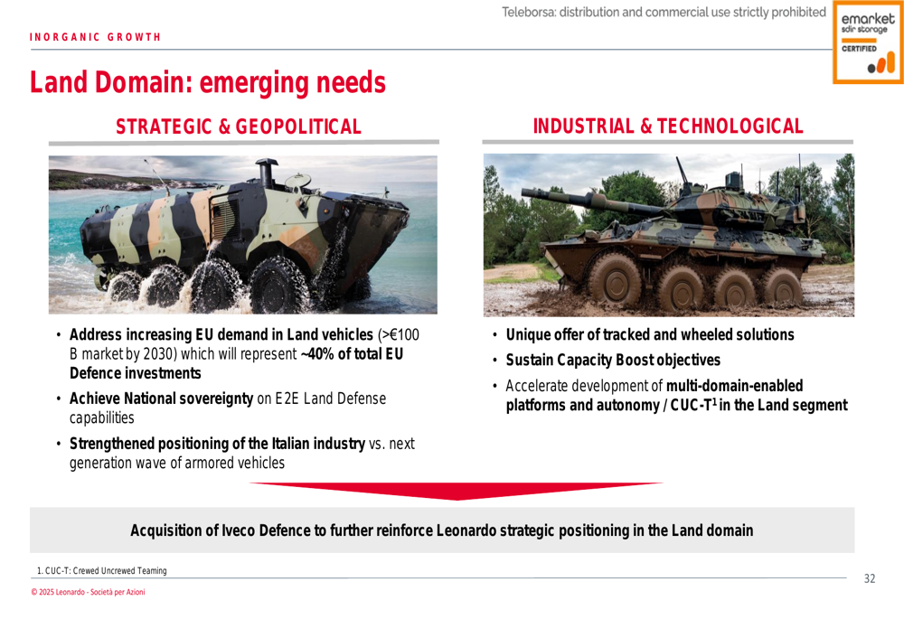 A significant recent acquisition is Iveco Defence, which strengthens Leonardo’s position in the land domain. The land defense market is expected to exceed €100 billion by 2030 and represent approximately 40% of total EU defense investments.