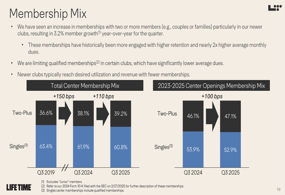 Life Time's presentation highlighted a strategic shift in membership composition, with an increasing focus on higher-value "Two-Plus" memberships (couples and families). This shift has been consistent across both established and newer clubs.